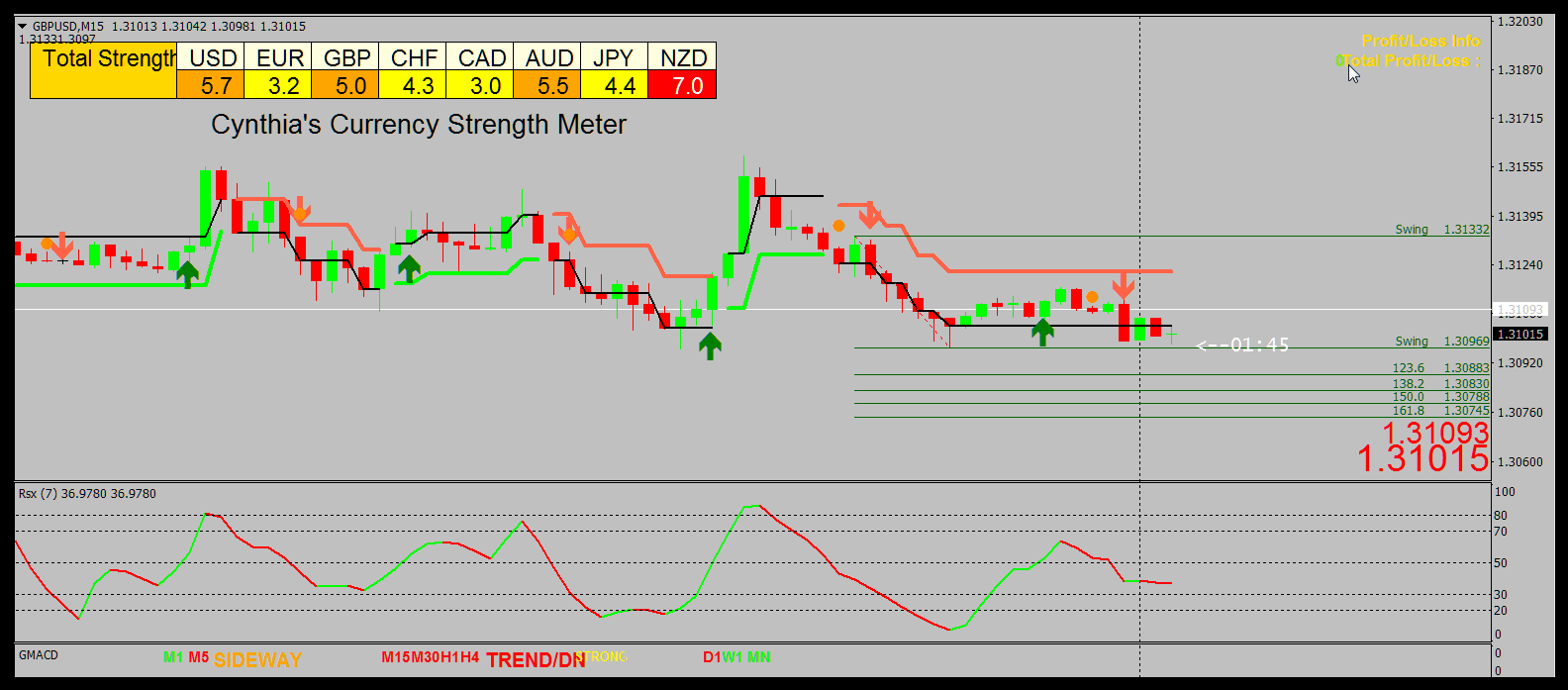 Here is the GbpUsd M15 at the end of the day when the USD and GBP are relatively the same orange medium strong strength, although the GBP is slightly weaker…so the trend is flat and the price is sitting on a Fibonacci swing line…if it breaks down lower, the GBP will get weaker as the USD gets stronger and the fib extension levels are automatically drawn for targets: